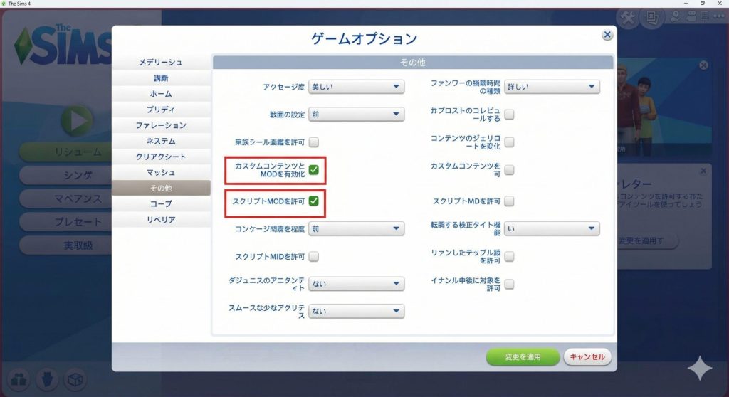 - ゲームを開き、Sims4オプションでCcを有効にします。