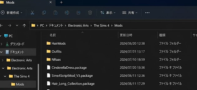 シムズ4のMODは、基本的に以下のフォルダへ入れます。