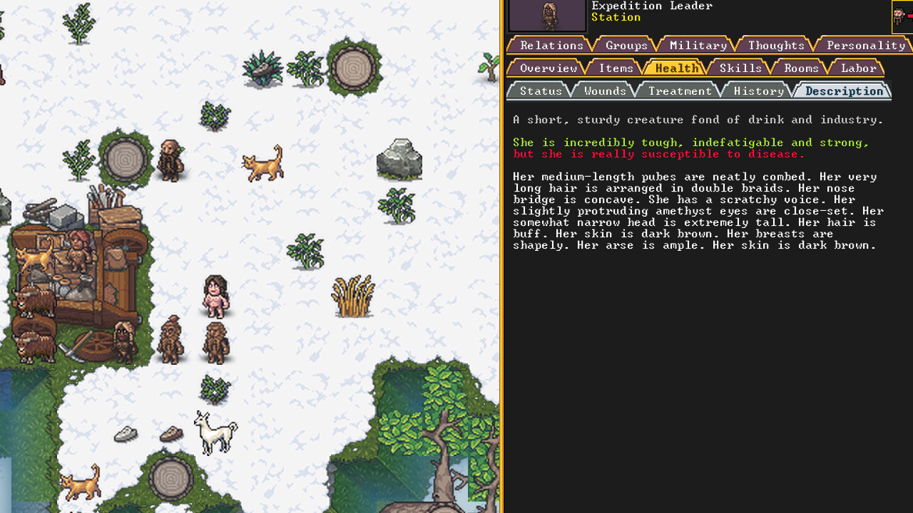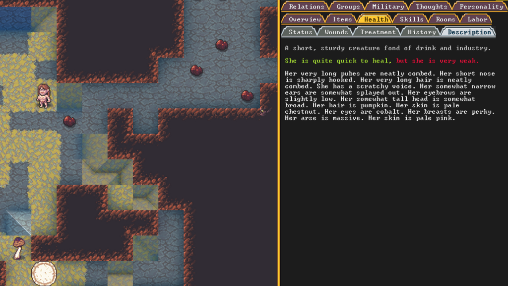この MOD は、バニラのドワーフ要塞の すべての生き物に繊細な体の部分と組織をテクスチャと説明 (胸のサイズ、陰毛、胸毛) とともに追加します。