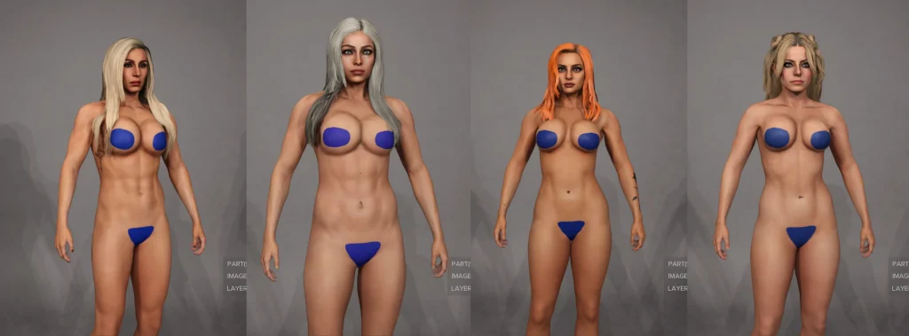 またヌードにも変更できますがNEXUSMODバージョンでは上記のように乳首・まんこ部分が青いもので隠されているので完全なヌードではありません。
