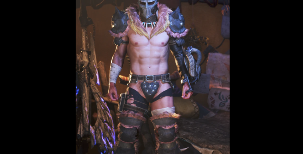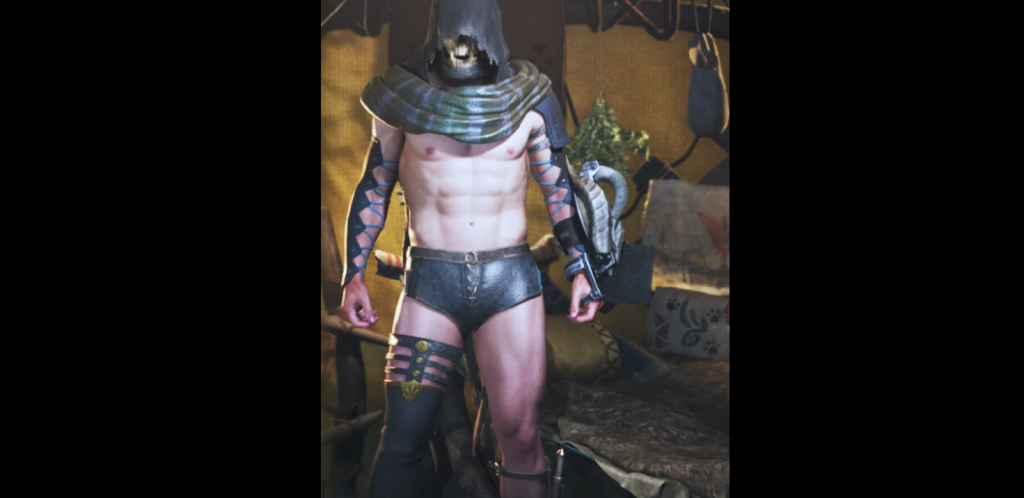 モンスターハンターワイルズの男性キャラ向けに【「シュウウー(Xu Wu)」装備を大胆にアレンジし、官能的かつ露出度の高いセクシー仕様】に変更するエロMOD。