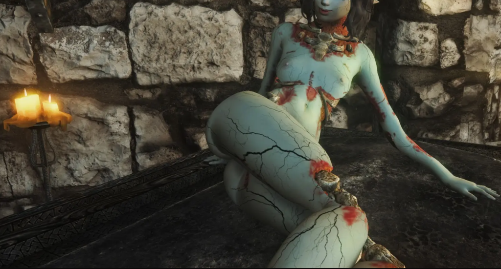 肌は部分的に腐食・縫合されており、死体らしさと性的魅力が同居する異形美を演出。SexLabやNecro系MODとの連携で、死者プレイ・屍姦RPにも完全対応した変態向けゾンビ種族MOD。