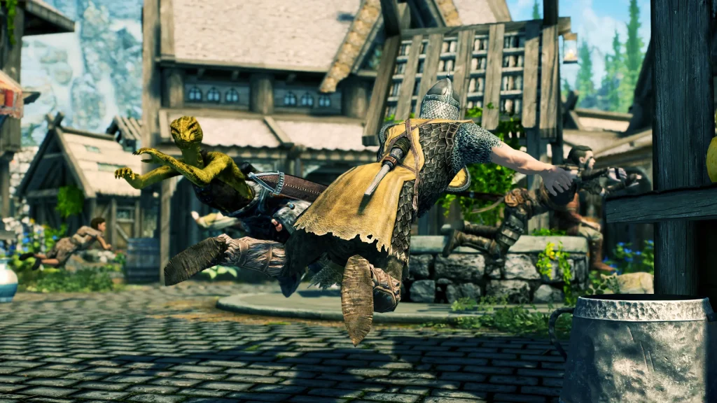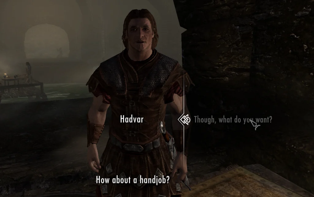 また、ホワイトランやリフテンなど、特定の都市には薬物売人や変態的な常連客NPCが配置されており、特定のルートを進むことで彼らとの淫靡な関係性が発展する。