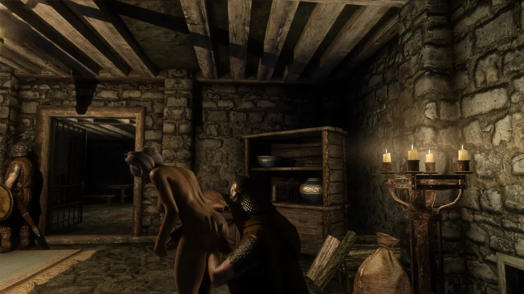 NPCが装備解除・所持品チェック・身体検査(SexLabアニメ連動)を行い、性的ないたずらや強制プレイが発生することも。
