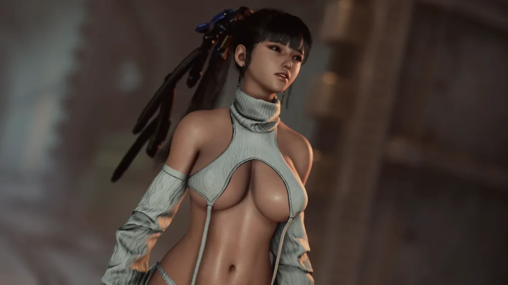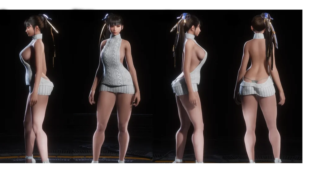 下半身はパンツレスも選択可能で、セーター一枚で素足・ノーパンという背徳的スタイルも実現。ヒップラインや腰回りの肉感もセーター越しにくっきり浮かび、戦闘中の揺れやポージングで視覚的エロスが炸裂。