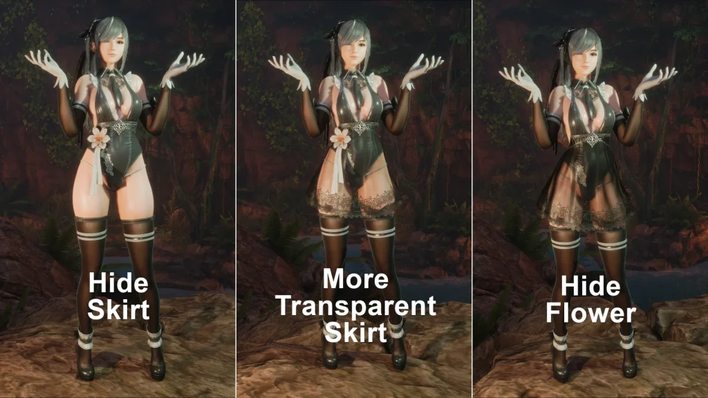 フリル付きの極小エプロン、露出度の高い胸元、下着あり・なし、網タイツ・裸足・ヒールなどパーツの切り替えが可能。