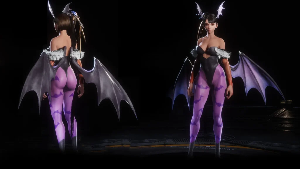 特徴的なコウモリ翼付きヘッドドレス、ハート型の胸開きレオタード、紫の網タイツ、そして豊満なバストと尻を大胆に強調したデザインが完全移植。